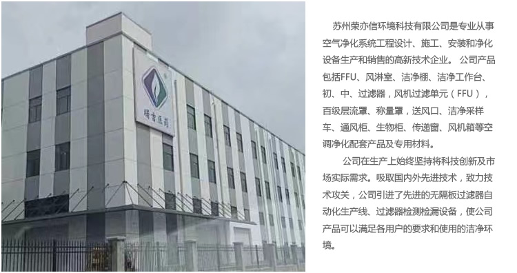 蘇州榮亦信環(huán)境科技有限公司是專(zhuān)業(yè)從事空氣凈化系統(tǒng)工程設(shè)計(jì)、施工、安裝和凈化設(shè)備生產(chǎn)和銷(xiāo)售的企業(yè)。 公司產(chǎn)品包括FFU、風(fēng)淋室、潔凈棚、潔凈工作臺(tái)、初、中、過(guò)濾器,風(fēng)機(jī)過(guò)濾單元(FFU),百級(jí)層流罩、稱(chēng)量罩,送風(fēng)口、潔凈采樣車(chē)、通風(fēng)柜、生物安全柜、傳遞窗、風(fēng)機(jī)箱等空調(diào)凈化配套產(chǎn)品及專(zhuān)用材料。公司在生產(chǎn)上始終堅(jiān)持將科技創(chuàng)新及市場(chǎng)實(shí)際需求。吸取國(guó)內(nèi)外先進(jìn)技術(shù),致力技術(shù)攻關(guān),公司引進(jìn)了先進(jìn)的無(wú)隔板過(guò)濾器自動(dòng)化生產(chǎn)線(xiàn)、過(guò)濾器檢測(cè)檢漏設(shè)備,使公司產(chǎn)品可以滿(mǎn)足各用戶(hù)的要求和使用的潔凈環(huán)境。公司擁有技術(shù)專(zhuān)業(yè)的科技人員,專(zhuān)業(yè)的設(shè)備制作人員,工程安裝施工人員,我公司不斷創(chuàng)新,不斷發(fā)展,致力于空調(diào)凈化系統(tǒng)的新設(shè)備、新技術(shù)的研發(fā)和生產(chǎn)。